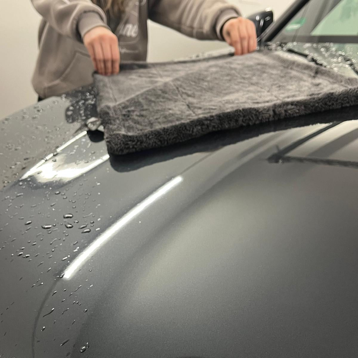 Das Nanowipe Mikrofasertuch (1400 GSM) ermöglicht eine schonende, streifenfreie Fahrzeugtrocknung.